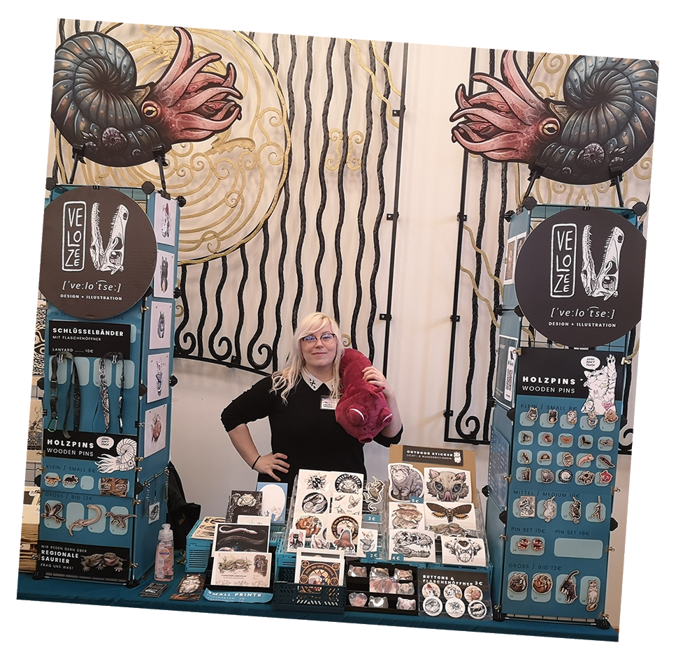 Ahoi. Ich bin Sandra aka. Velozee und seit 2013 stelle ich meine Kunst auf Festivals & Conventions vor.Mein Schwerpunkt liegt auf Artprints von denen man noch was lernen kann, süßen Viechern und subtiler Fanart. Meist in Begleitung einer Katze.